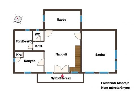 Földszint 70 nm: Nappali, 2 szoba, konyha, kamra, fürdő+WC-vel, külön WC, nyitott terasz.