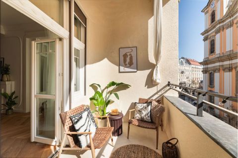 A három oldalról védett, intim terasz a lakás egyik legkülönlegesebb eleme: egy nyugodt, mégis inspiráló városi oázis, ahonnan közvetlen kilátás nyílik az Egyetem térre és a templomra. Ritka adottság a belvárosban, amely egyszerre kínál intimitást és panorámát.